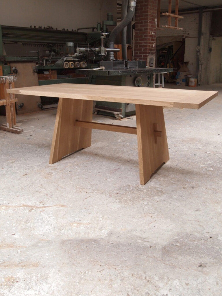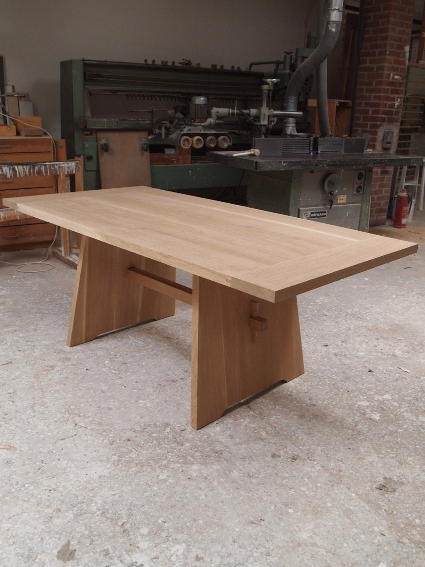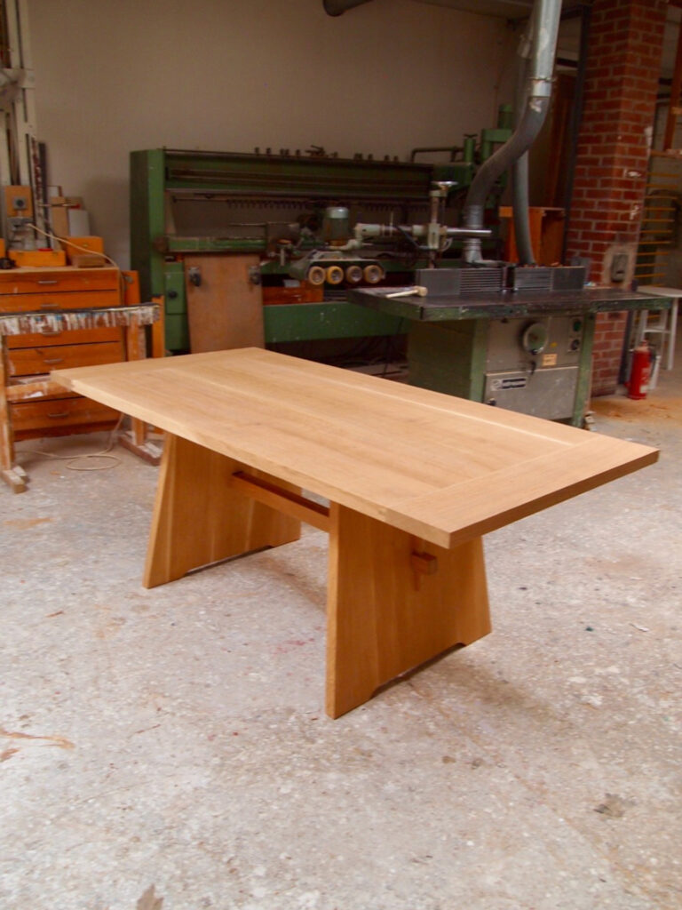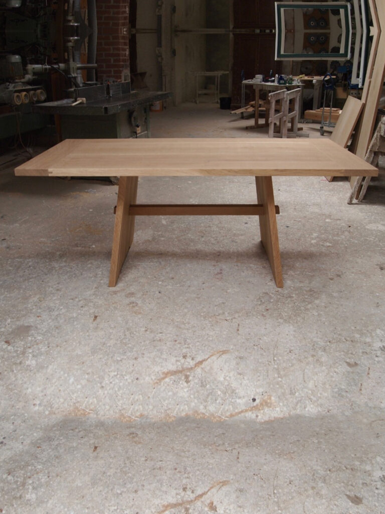 The oak planks are bought from local traders in a thickness of 62mm, the wood is then dried for a few more weeks. We then plane the strips to 40 mm. The entire table is 40mm thick. The surface consists of 5 strips of 20 cm wide oak strips that are glued together, with 2 end pieces glued in from both sides to prevent the surface from sticking.