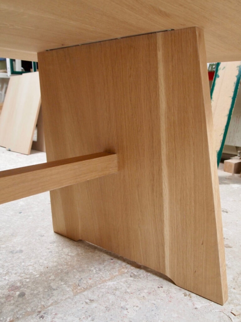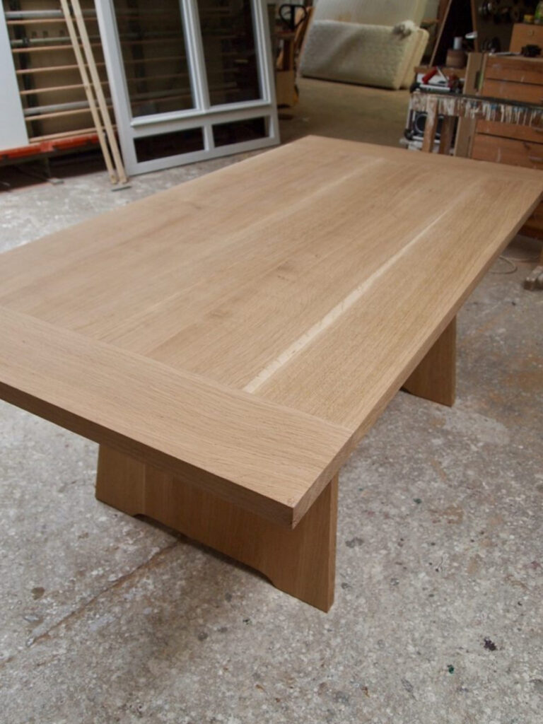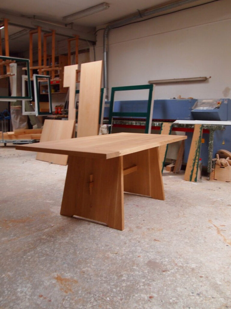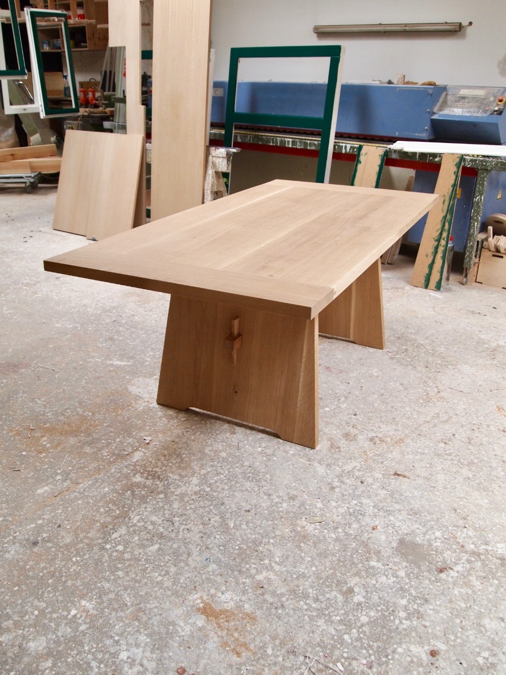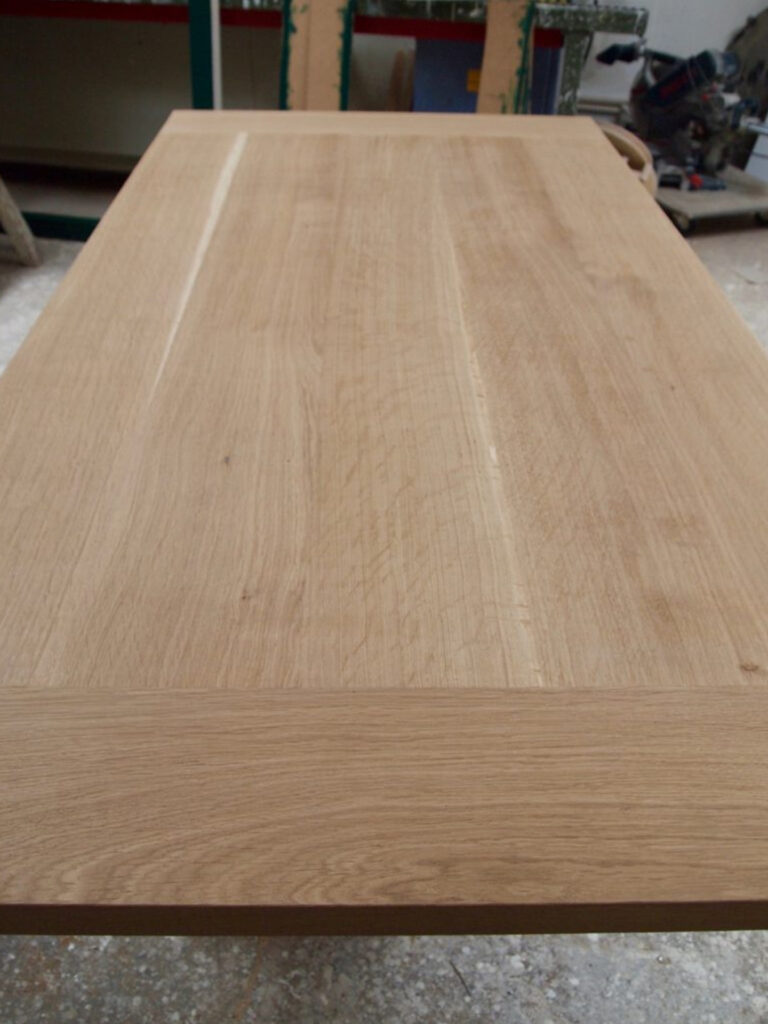 Die Eichenbretter werden von lokalen Händlern in einer Dicke von 62 mm gekauft, das Holz wird dann noch einige Wochen getrocknet. Anschließend werden die Streifen auf 40 mm gehobelt. Der gesamte Tisch hat eine Dicke von 40 mm. Die Oberfläche besteht aus 5 Streifen Eichenholz, die jeweils 20 cm breit sind und zusammengeleimt werden, mit 2 Endstücken, die von beiden Seiten verleimt sind, um ein Verziehen der Oberfläche zu verhindern.