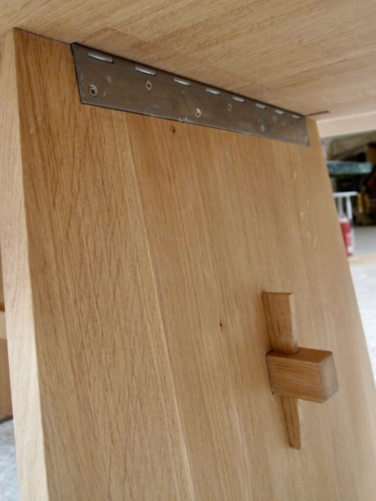 The legs are attached with stainless steel industrial strength hinges. This allows for easy setup for the customer, easy delivery, and a strong connection between the top and legs. A strip of oak secures the legs together.