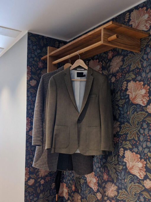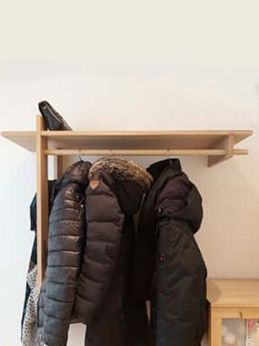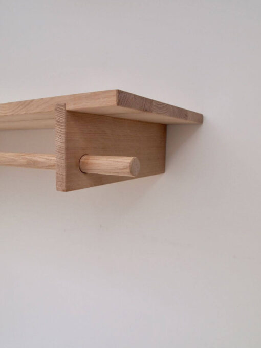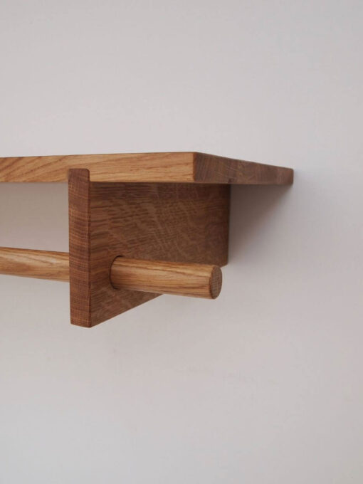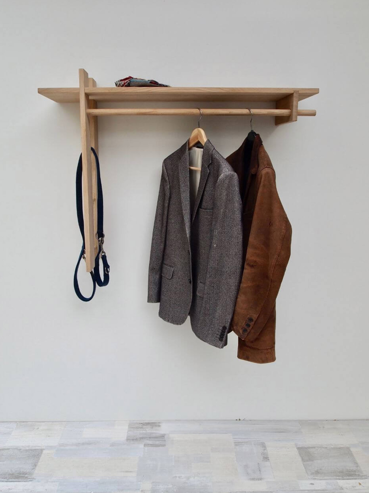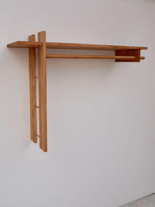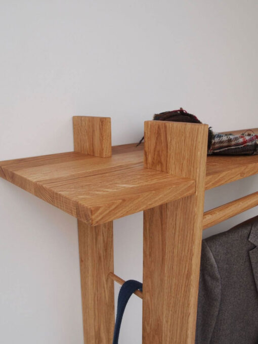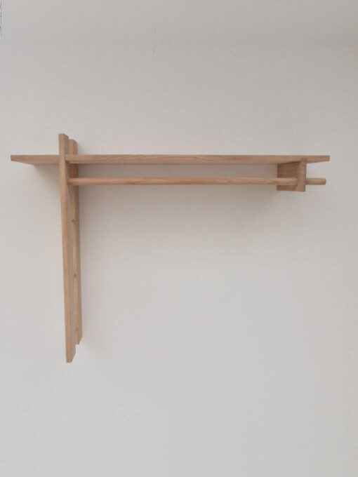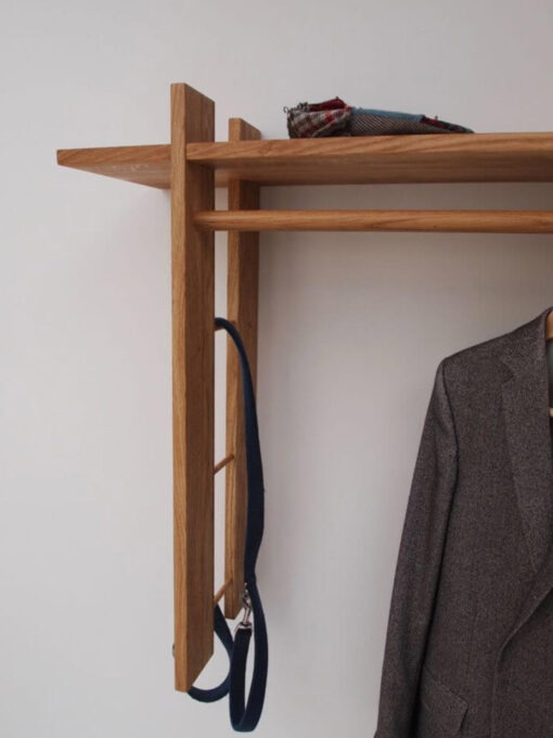 Wall coat rack or clothes rack made of oak with a bit more functionality. The top panel is ideal for hats or sweaters. The sidebars are ideal for belts, ties, scarves, and other accessories. Item is flat packed. No external screws. CUSTOM ORDERS FOR THIS ITEM ARE POSSIBLE