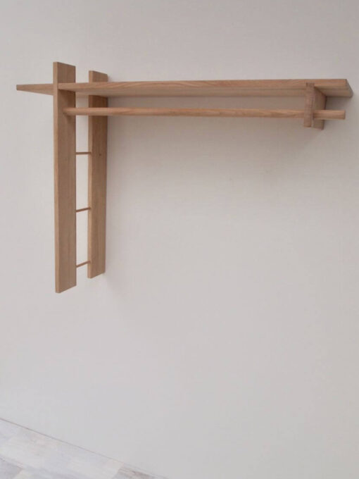 Wandgarderobe oder Kleiderständer aus Eiche mit etwas mehr Funktionalität. Die obere Platte ist ideal für Mützen oder Pullover. Die Seitenleisten sind ideal für Gürtel, Krawatten, Schals und andere Accessoires. Artikel ist flach verpackt. Keine externen Schrauben. KUNDENSPEZIFISCHE BESTELLUNGEN FÜR DIESEN ARTIKEL SIND MÖGLICH